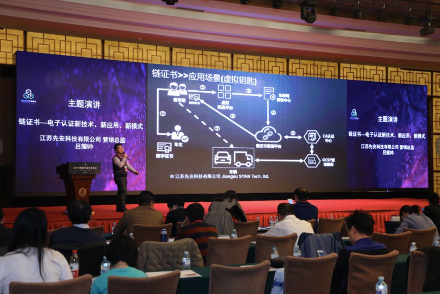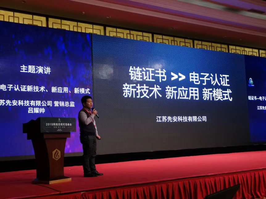 江蘇先安科技有限公司受邀參加峰會,參與峰會主題演講、典型可信服務應用評選。在本次峰會上,以創新、融合、發展主題,攜《鏈證書-電子認證 新技術-新應用-新模式》進行主題演講。