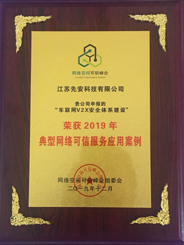 在本次峰會上,江蘇先安科技以"車聯網V2X安全體系建設"可信服務應用,在本次峰會中,從全國數百家參選項目中脫穎而出,榮獲"2019年典型網絡可信服務應用案例"大獎。