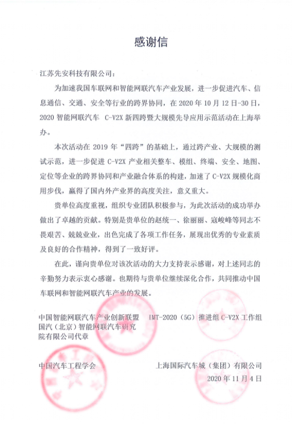 2021年1月20日,中國智能網(wǎng)聯(lián)汽車產(chǎn)業(yè)創(chuàng)新聯(lián)盟、IMT-2020(5G)推進(jìn)組C-V2X工作組、中國汽車工程學(xué)會(huì)、上海國際汽車城(集團(tuán))有限公司聯(lián)合發(fā)來感謝信,對(duì)江蘇先安科技有限公司(以下簡稱“先安科技”)在2020智能網(wǎng)聯(lián)汽車C-V2X新四跨暨大規(guī)模先導(dǎo)應(yīng)用示范活動(dòng)中所做的工作表示感謝。