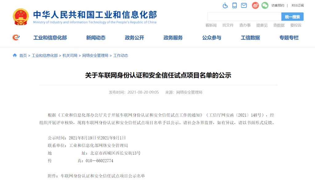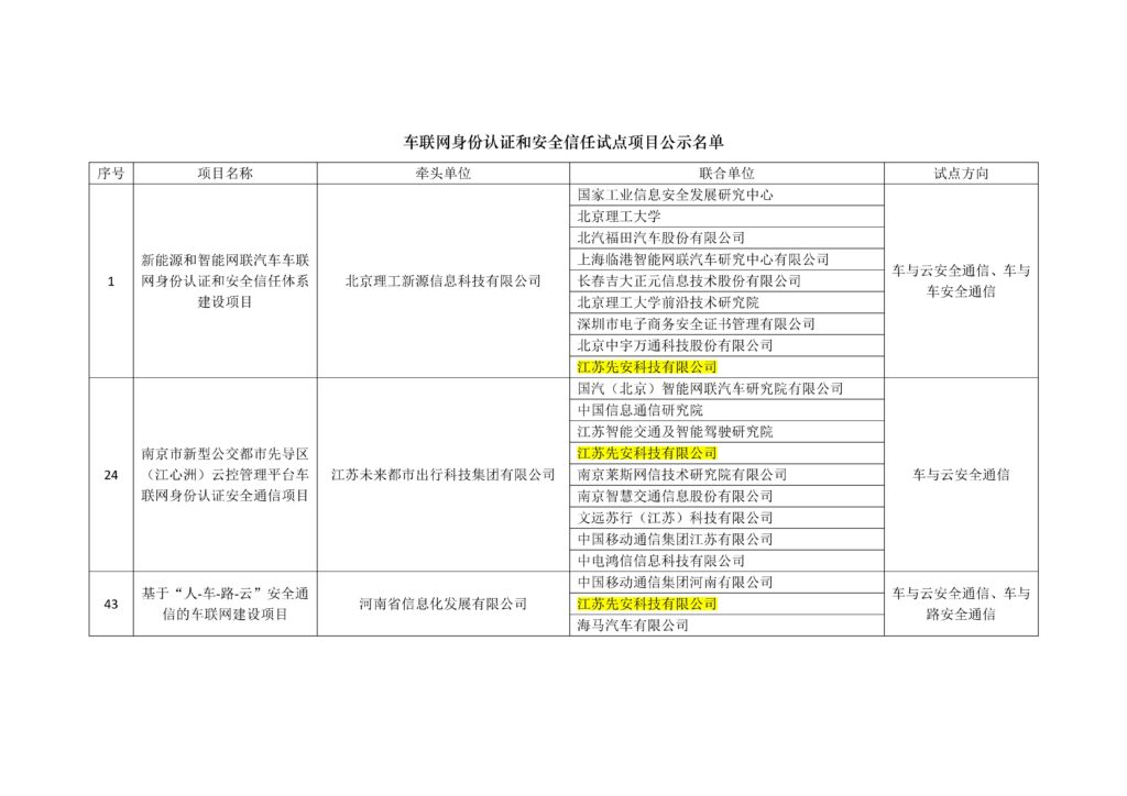日前,國家工信部發布《關于車聯網身份認證和安全信任試點項目名單的公示》,江蘇先安科技有限公司(以下簡稱“先安科技”)參與申報的3個項目均成功入選試點項目名單。