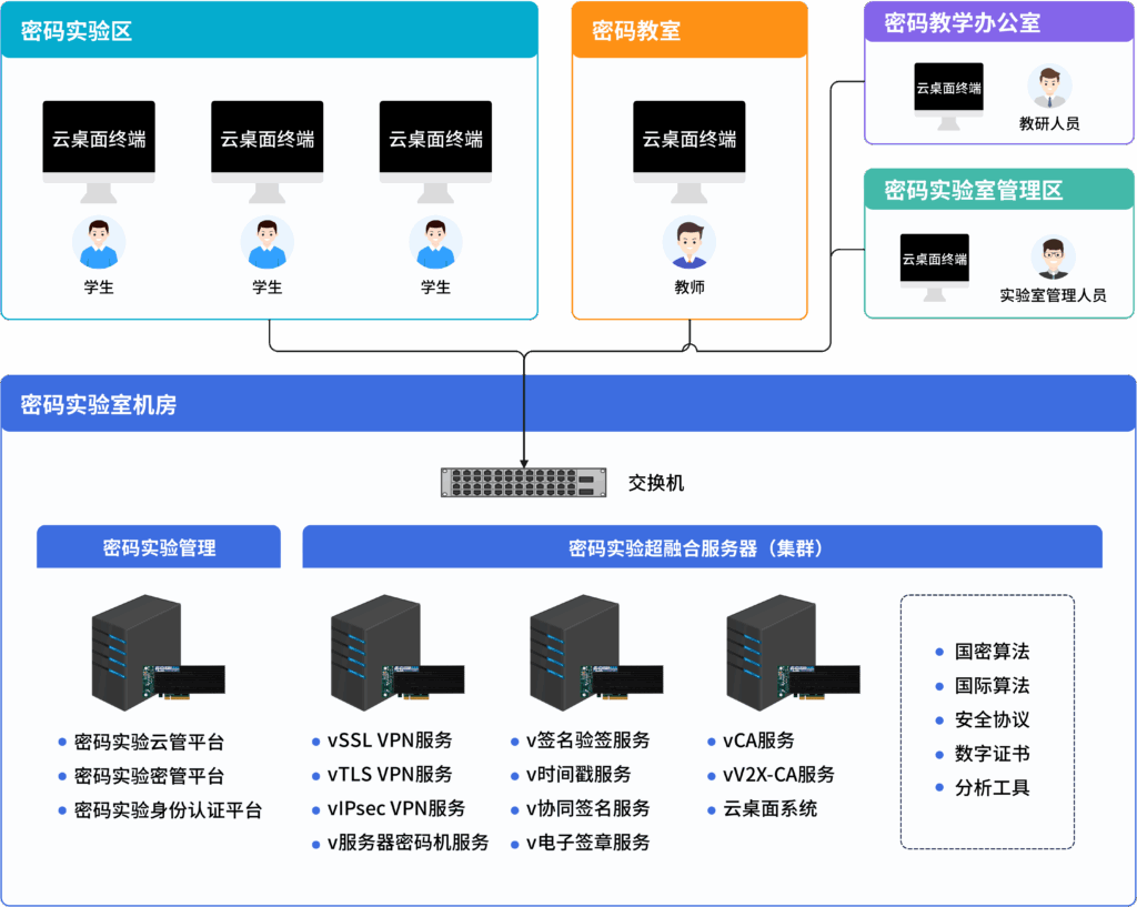 - 教學(xué)實驗場景平滑擴容:支持平滑擴容、擴展密碼教學(xué)功能和實訓(xùn)場景。